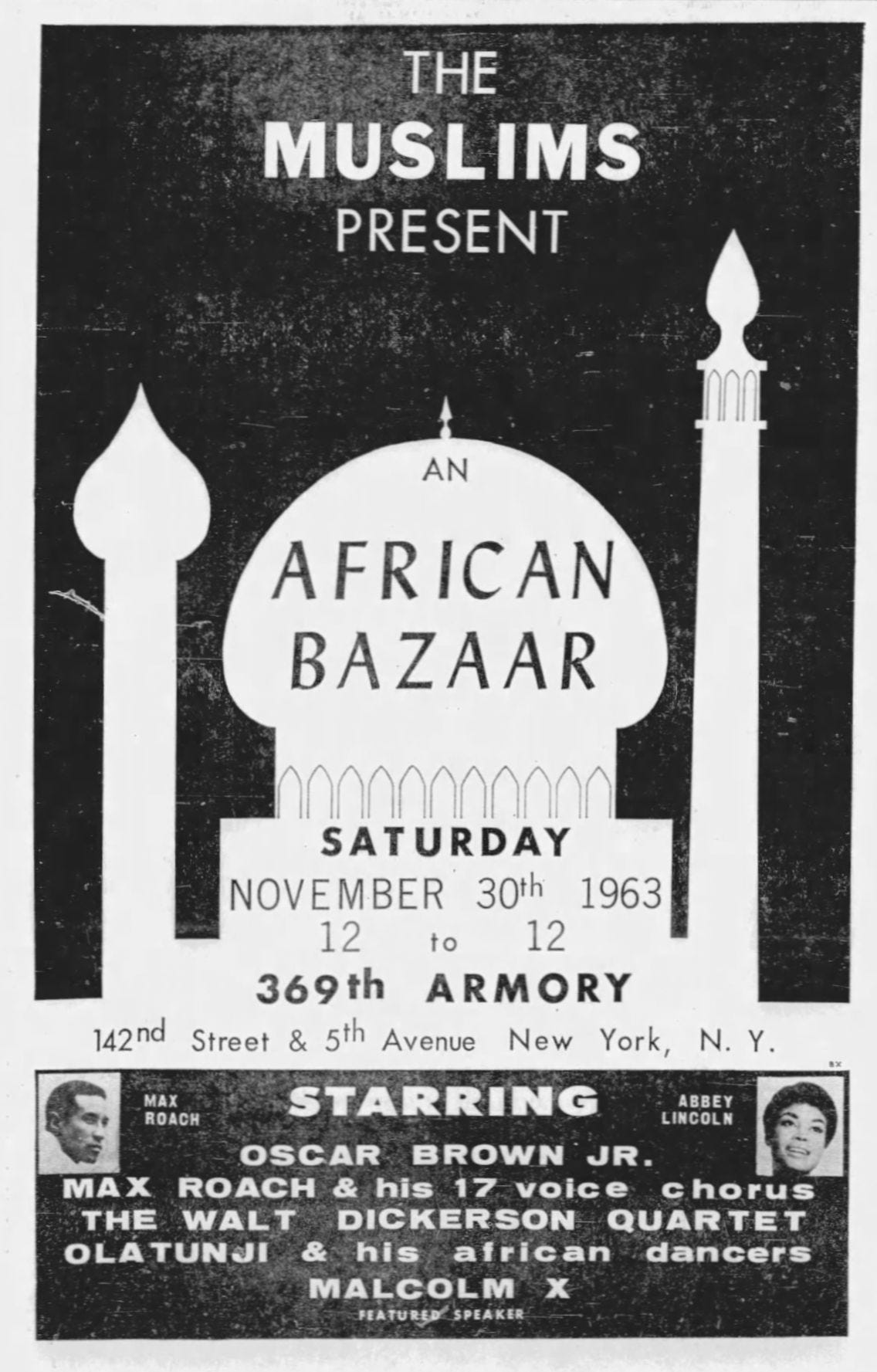 From a material standpoint, Lincoln and Roach performed the work at numerous benefits, for organizations that had diverging strategies. Its January 1961 world premiere was a CORE event. A Philadelphia performance for the NAACP’s Annual Convention the following summer sparked discussions of an ultimately unrealized tour sponsored by the organization. On November 30, 1963, Roach, Lincoln, Brown, Babatunde Olatunji, and a choir were booked to perform the suite at a Nation of Islam “African Bazaar” fair in Harlem. The featured speaker was Malcolm X, who was to make, just a day later, the comment about John F. Kennedy’s death that would set in motion the chain of events concluded by his own assassination.